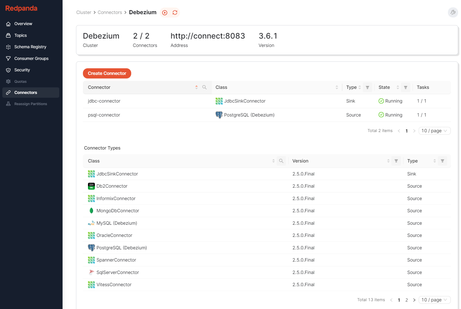 Once we have logical replication enabled with WAL on the source Postgresql Database, we can then install the Debezium connect plugin into the Redpanda cluster. We also enable the Redpanda WebUI Console with the Debezium connect config which gives us some nice visibility and observability of the Debezium Source and Sink Connectors in action: